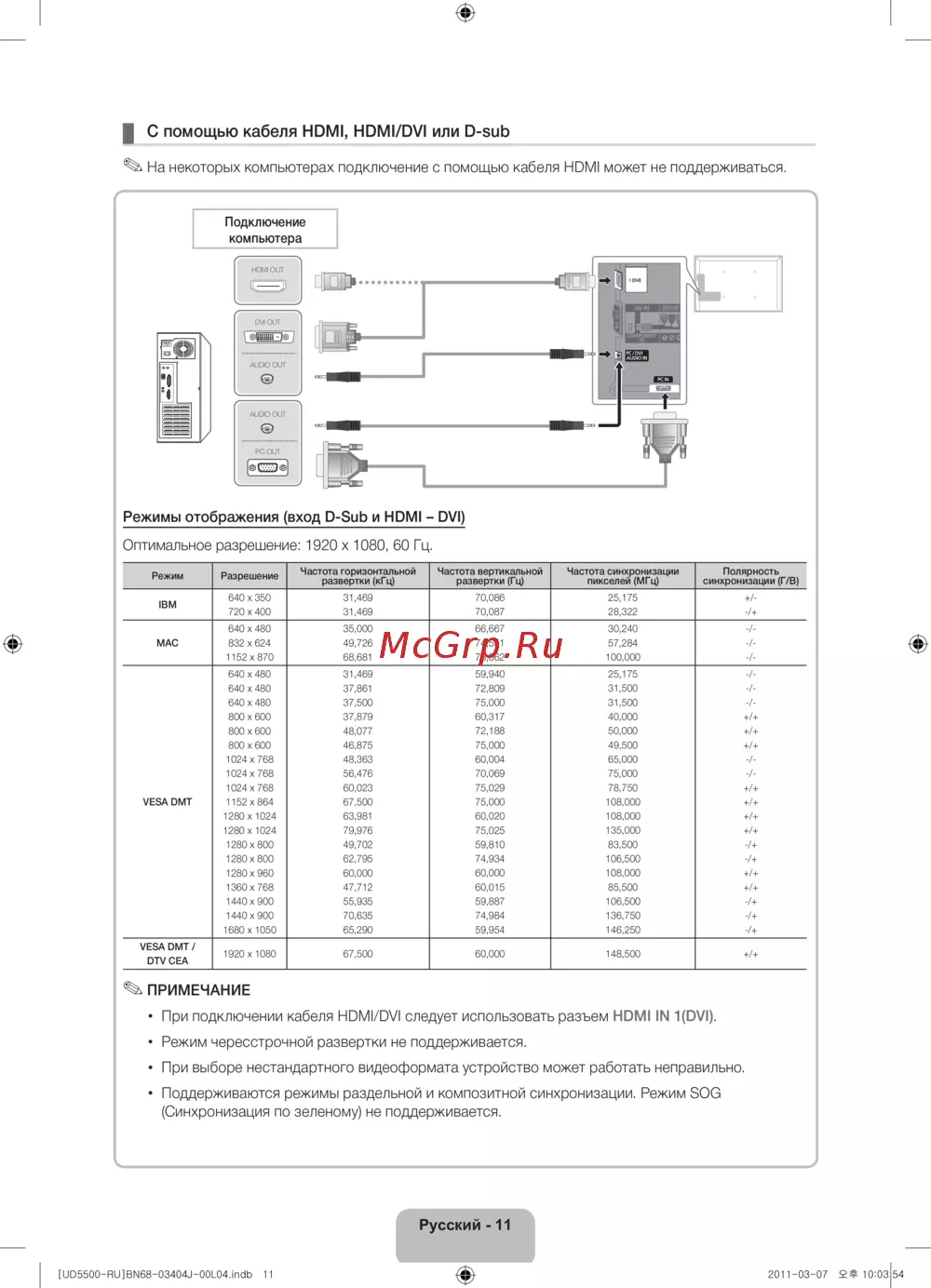 Режимы отображения (вход D-Sub и HDMI – DVI)