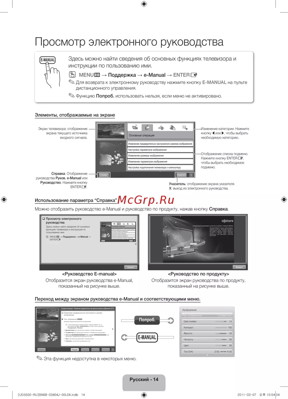Переход между экраном руководства e-Manual и соответствующими меню.