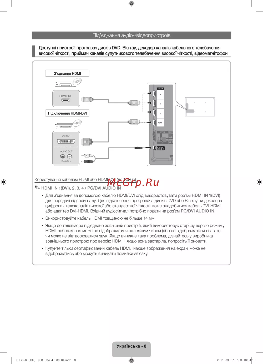 Для з’єднання за допомогою кабелю HDMI/DVI слід використовувати роз’єм HDMI IN 1(DVI)