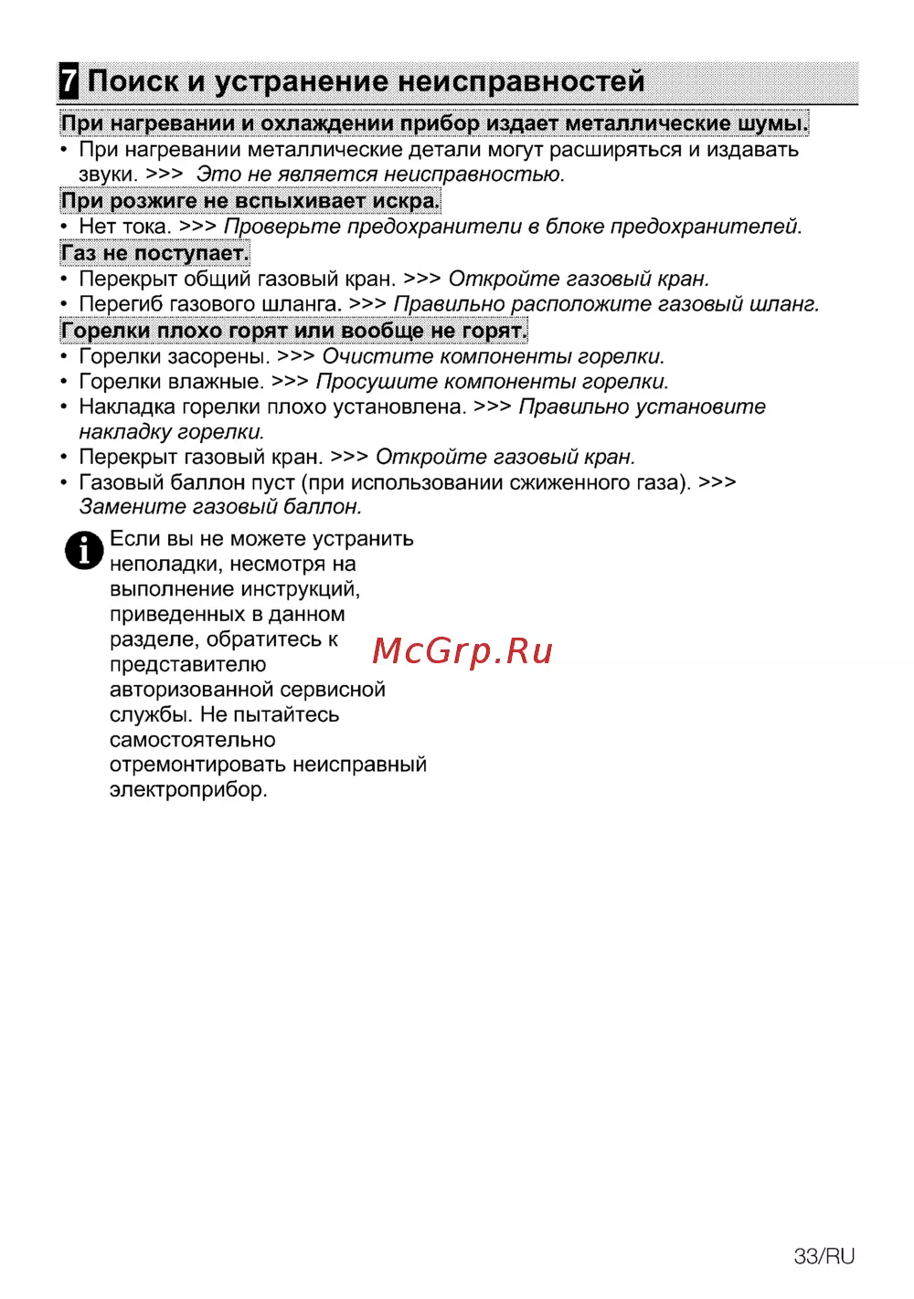 Q Поиск и устранение неисправностей При нагревании и охла При нагревании металлические детали могут расширяться и издавать звуки Это не является неисправностью При розжиге не вспь1хива Нет тока Проверьте предохранители в блоке предохранителей Газ не поступает Перекрыт общий газовый кран Откройте газовый кран Перегиб газового шланга Правильно расположите газовый шланг Горелки плохо горят или вообще не горят 1 Горелки засорены Очистите компоненты горелки Горелки влажные Просушите компоненты горелки Накладка горелки плохо установлена Правильно установите накладку горелки Перекрыт газовый кран Откройте газовый кран Газовый баллон пуст при использовании сжиженного газа Замените газовый баллон Если вы не можете устранить неполадки несмотря на выполнение инструкций приведенных в данном разделе обратитесь к представителю авторизованной сервисной службы Не пытайтесь самостоятельно отремонтировать неисправный электроприбор О зз ии