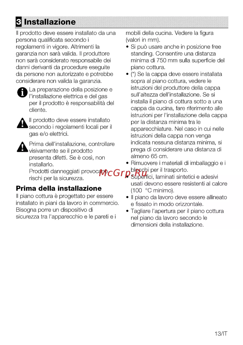 Installazione II prodotto deve essere installato da una persona qualificata secondo i regolamenti in vigore Altrimenti la garanzia non sará valida II produttore non sará considerato responsabile del danni derivanti da procedure eseguite da persone non autorizzate e potrebbe considerare non valida la garanzia La preparazione della posizione e I installazione elettrica e del gas per I prodotto é responsabilitá del cliente A ll prodotto deve essere installato secondo i regolamenti locali per I gas e o elettrici A Prima dell installazione controllare visivamente se I prodotto presenta difetti Se é cosí non installarlo Prodotti danneggiati provocano rischi per la sicurezza Prima della installazione II piano cottura é progettato per essere installato in piani da lavoro in commercio Bisogna porre un dispositivo di sicurezza tra l apparecchio e le pareti e i mobili della cucina Vedere la figura valori in mm Si pud usare anche in posizione free standing Consentiré una distanza mínima di 750 mm sulla superficie del piano cottura Se la cappa deve essere installata sopra al piano cottura vedere le istruzioni del produttore della cappa sull altezza dell installazione Se si installa I piano di cottura sotto a una cappa da cucina fare riferimento alie istruzioni per I installazione della cappa per la distanza mínima tra le apparecchiature Nel caso in cui nelle istruzioni della cappa non venga indicata nessuna distanza mínima si prega di considerare una distanza di almeno 65 cm Rimuovere i material di imballaggio e i blocchi per I trasporto Superfici laminati sintetici e adesivi usati devono essere resistenti al calore 100 C mínimo II piano da lavoro deve essere allineato e fissato in modo orizzontale Tagliare l apertura per I piano cottura nel piano da lavoro secondo le dimensión della installazione 13 IT