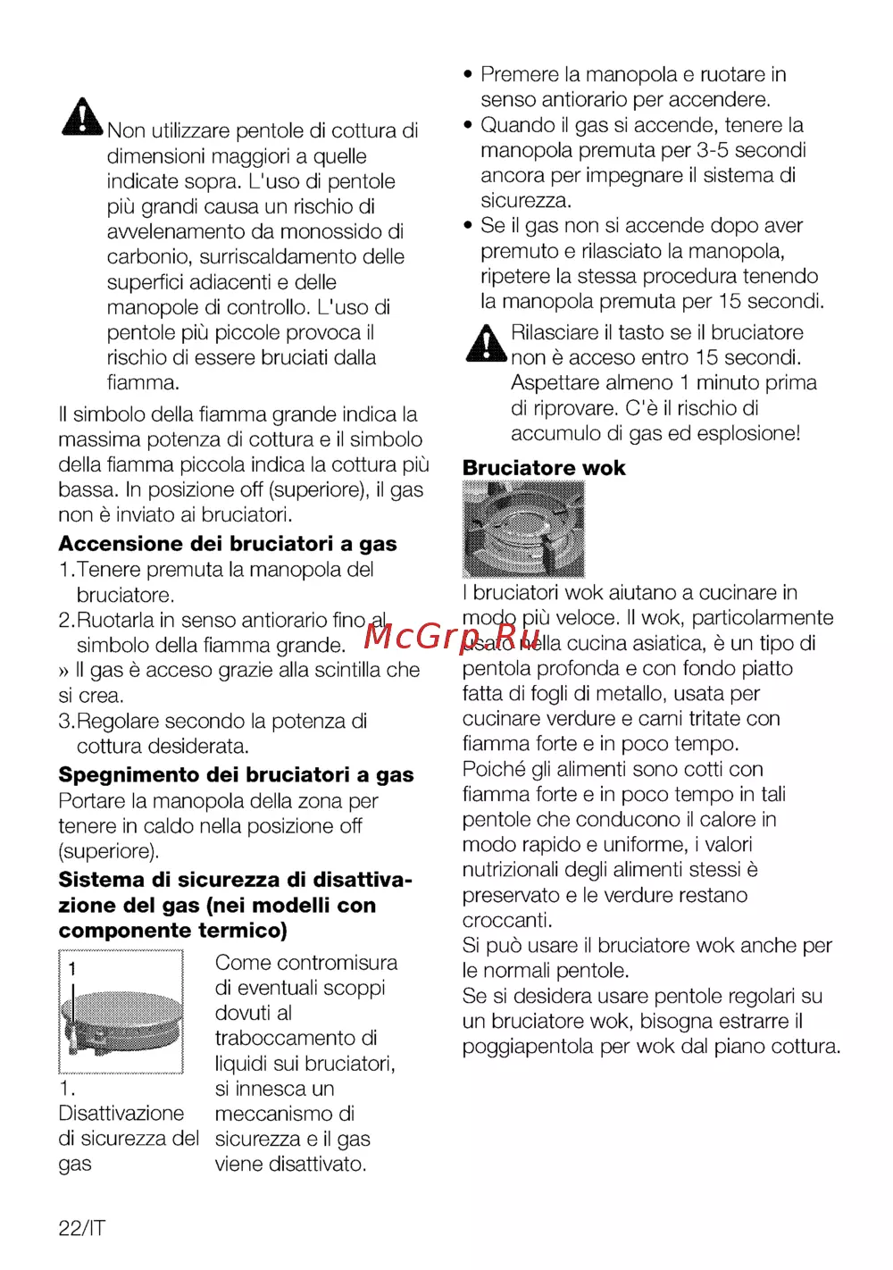 A Non utilizzare pentole di cottura di dimensioni maggiori a quelle indícate sopra L uso di pentole piü grandi causa un rischio di awelenamento da monossido di carbonio surriscaldamento delle superfici adiacenti e delle manopole di controllo L uso di pentole piü piccole provoca I rischio di essere bruciati dalla fiamma II símbolo della fiamma grande indica la massima potenza di cottura e I símbolo della fiamma piccola indica la cottura piü bassa In posizione off superiore I gas non é inviato ai bruciatori Premere la manopola e ruotare in senso antiorario per accendere Quando I gas si accende tenere la manopola premuta per 3 5 second ancora per impegnare II sistema di sicurezza Se I gas non si accende dopo aver premuto e rilasciato la manopola ripetere la stessa procedura tenendo la manopola premuta per 15 second A Rilasciare I tasto se I bruciatore non è acceso entro 15 second Aspettare almeno 1 minuto prima di riprovare C è il rischio di accumulo di gas ed esplosione Bruciatore wok Accensione dei bruciatori a gas 1 Tenere premuta la manopola del bruciatore 2 Ruotarla in senso antiorario fino al símbolo della fiamma grande II gas é acceso grazie alia scintilla che si crea 3 Regolare secondo la potenza di cottura desiderata Spegnimento dei bruciatori a gas Portare la manopola della zona per tenere in caldo nella posizione off superiore Sistema di sicurezza di disattivazione del gas nei modelli con componente térmico Come contromisura di eventuali scoppi dovuti al traboccamento di liquidi sui bruciatori si innesca un Disattivazione meccanismo di di sicurezza del sicurezza e I gas gas viene disattivato 22 IT I bruciatori wok aiutano a cucinare in modo piü veloce II wok particolarmente usato nella cucha asiatica è un tipo di pentola profonda e con fondo piatto fatta di fogli di métallo usata per cucinare verdure e carni tritate con fiamma forte e in poco tempo Poiché gil alimenti sono cotti con fiamma forte e in poco tempo in tali pentole che conducono II calore in modo rápido e uniforme i valori nutrizionali degli alimenti stessi è preservato e le verdure restaño croccanti Si puo usare I bruciatore wok anche per le normal pentole Se si desidera usare pentole regolari su un bruciatore wok bisogna estrarre I poggiapentola per wok dal piano cottura