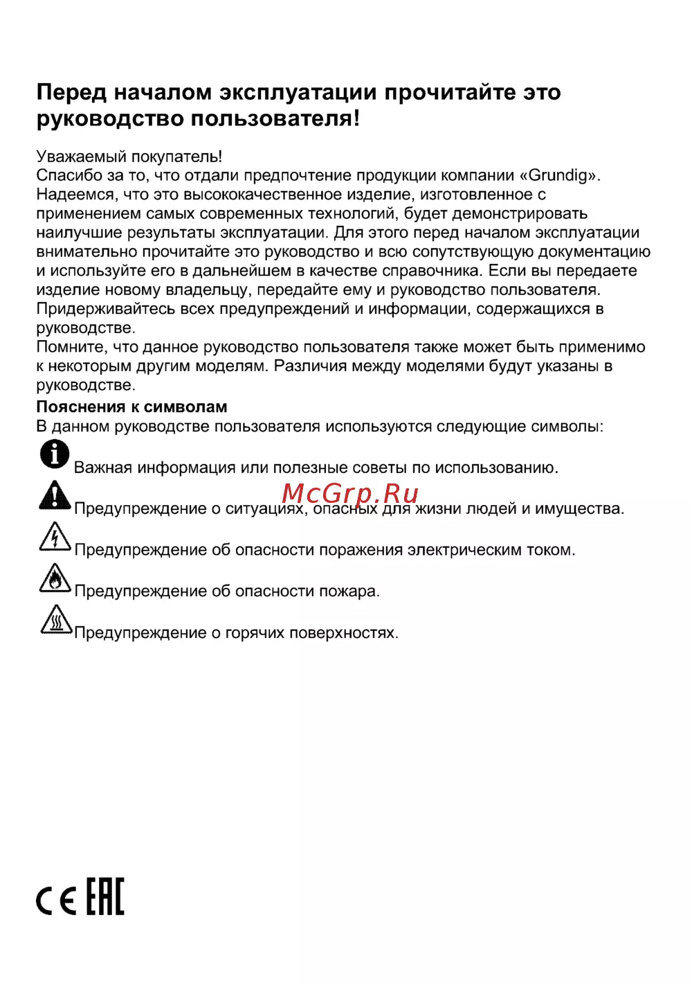 Перед началом эксплуатации прочитайте это руководство пользователя Уважаемый покупатель Спасибо за то что отдали предпочтение продукции компании Grundig Надеемся что это высококачественное изделие изготовленное с применением самых современных технологий будет демонстрировать наилучшие результаты эксплуатации Для этого перед началом эксплуатации внимательно прочитайте это руководство и всю сопутствующую документацию и используйте его в дальнейшем в качестве справочника Если вы передаете изделие новому владельцу передайте ему и руководство пользователя Придерживайтесь всех предупреждений и информации содержащихся в руководстве Помните что данное руководство пользователя также может быть применимо к некоторым другим моделям Различия между моделями будут указаны в руководстве Пояснения к символам В данном руководстве пользователя используются следующие символы Важная информация или полезные советы по использованию А Предупреждение о ситуациях опасных для жизни людей и имущества Предупреждение об опасности поражения электрическим током Предупреждение об опасности пожара Аг Предупреждение о горячих поверхностях C ER