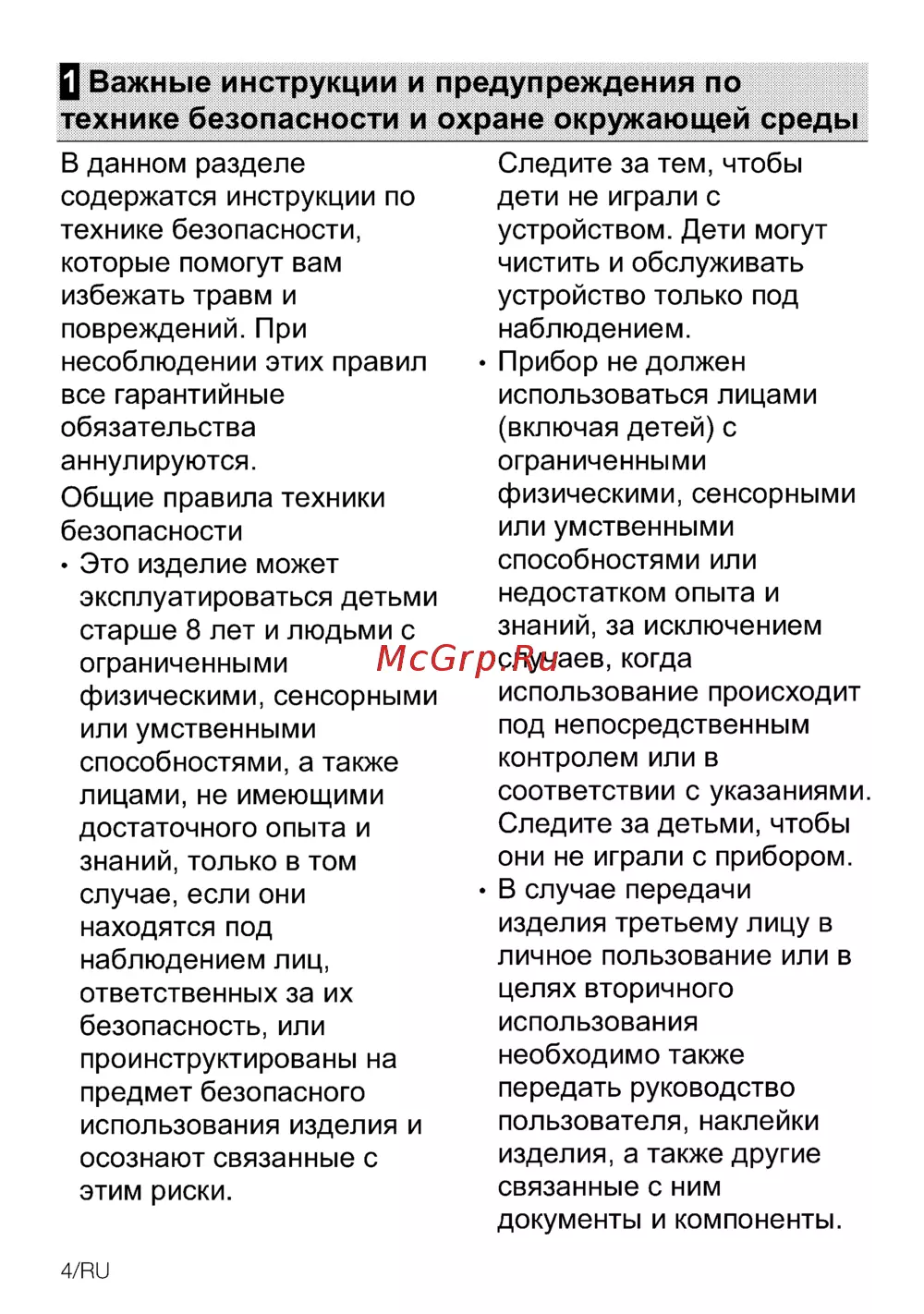 Ц Важные инструкции и предупреждения по технике безопасности и охране окружающей среды В данном разделе содержатся инструкции по технике безопасности которые помогут вам избежать травм и повреждений При несоблюдении этих правил все гарантийные обязательства аннулируются Общие правила техники безопасности Это изделие может эксплуатироваться детьми старше 8 лет и людьми с ограниченными физическими сенсорными или умственными способностями а также лицами не имеющими достаточного опыта и знаний только в том случае если они находятся под наблюдением лиц ответственных за их безопасность или проинструктированы на предмет безопасного использования изделия и осознают связанные с этим риски 4 Ии Следите за тем чтобы дети не играли с устройством Дети могут чистить и обслуживать устройство только под наблюдением Прибор не должен использоваться лицами включая детей с ограниченными физическими сенсорными или умственными способностями или недостатком опыта и знаний за исключением случаев когда использование происходит под непосредственным контролем или в соответствии с указаниями Следите за детьми чтобы они не играли с прибором В случае передачи изделия третьему лицу в личное пользование или в целях вторичного использования необходимо также передать руководство пользователя наклейки изделия а также другие связанные с ним документы и компоненты