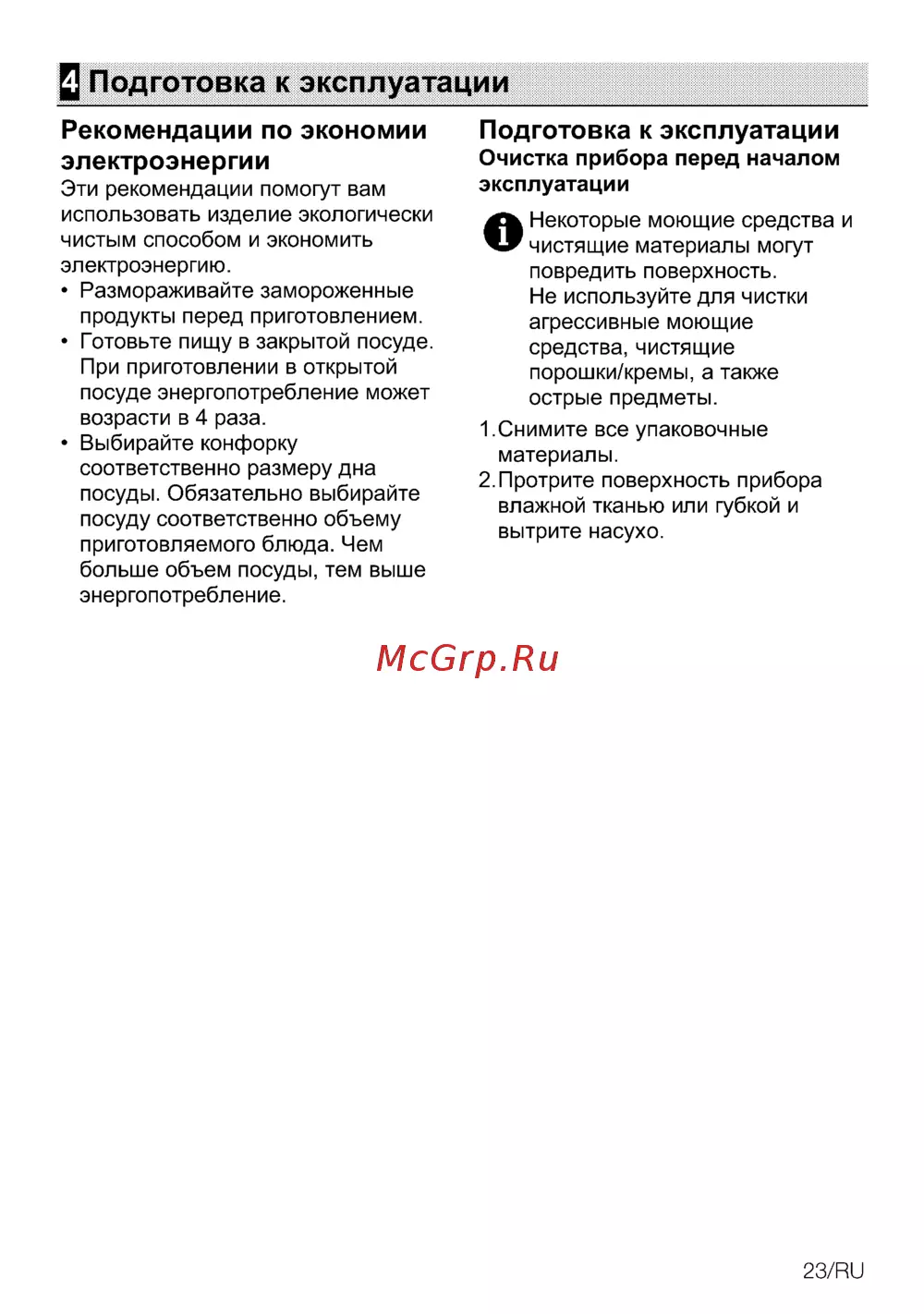 2 Подготовка к эксплуатации Рекомендации по экономии электроэнергии Эти рекомендации помогут вам использовать изделие экологически чистым способом и экономить электроэнергию Размораживайте замороженные продукты перед приготовлением Готовьте пищу в закрытой посуде При приготовлении в открытой посуде энергопотребление может возрасти в 4 раза Выбирайте конфорку соответственно размеру дна посуды Обязательно выбирайте посуду соответственно объему приготовляемого блюда Чем больше объем посуды тем выше энергопотребление Подготовка к эксплуатации Очистка прибора перед началом эксплуатации Некоторые моющие средства и чистящие материалы могут повредить поверхность Не используйте для чистки агрессивные моющие средства чистящие порошки кремы а также острые предметы 1 Снимите все упаковочные материалы 2 Протрите поверхность прибора влажной тканью или губкой и вытрите насухо 23 Ш