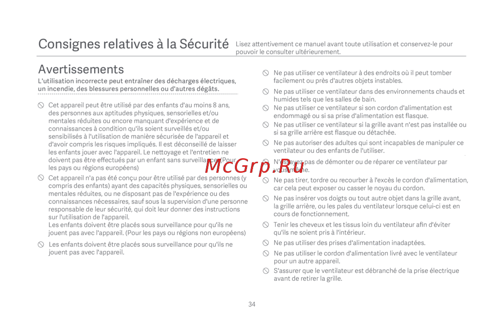 Ne pas utiliser ce ventilateur si la grille avant n'est pas installée ou