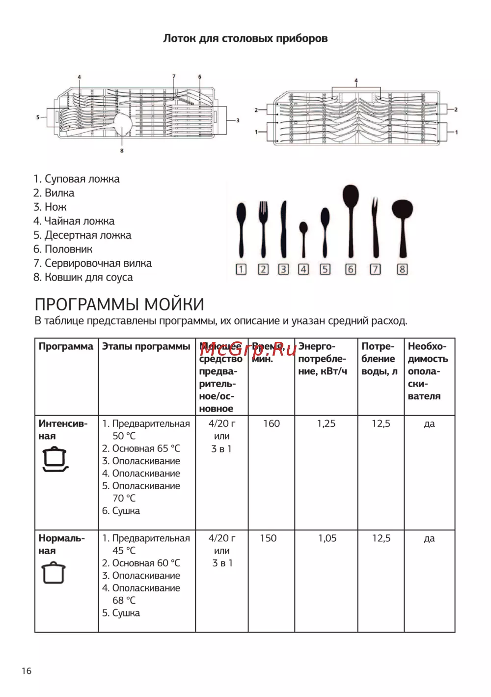 Лоток для столовых приборов 1 Суповая ложка 2 Вилка 3 Нож 4 Чайная ложка 5 Десертная ложка 6 Половник 7 Сервировочная вилка 8 Ковшик для соуса ЫШ ПРОГРАММЫ МОЙКИ В таблице представлены программы их описание и указан средний расход Программа Этапы программы Моющее средство предварительное основное Интенсив ная 1 Предварительная 50 С 2 Основная 65 С 3 Ополаскивание 4 Ополаскивание 5 Ополаскивание 70 С 6 Сушка 4 20 г или 3в1 Нормаль ная 1 Предварительная 45 С 2 Основная 60 С 3 Ополаскивание 4 Ополаскивание 68 С 5 Сушка 4 20 г или 3в1 о 16 Время мин 160 150 Потре бление воды л Необхо димость опола ски вателя 1 25 12 5 да 1 05 12 5 да Энерго потребле ние кВт ч