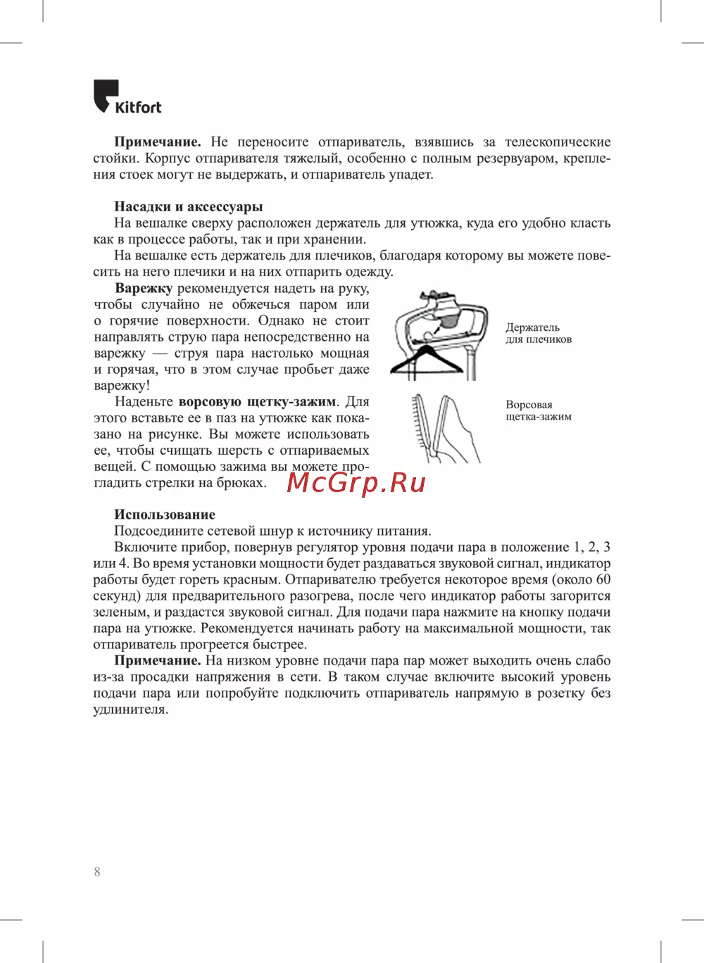 К1ЬРогЬ Примечание Не переносите отпариватель взявшись за телескопические стойки Корпус отпаривателя тяжелый особенно с полным резервуаром крепле ния стоек могут не выдержать и отпариватель упадет Насадки и аксессуары На вешалке сверху расположен держатель для утюжка куда его удобно класть как в процессе работы так и при хранении На вешалке есть держатель для плечиков благодаря которому вы можете пове сить на него плечики и на них отпарить одежду Варежку рекомендуется надеть на руку чтобы случайно не обжечься паром или о горячие поверхности Однако не стоит Держатель направлять струю пара непосредственно на для плечиков варежку струя пара настолько мощная и горячая что в этом случае пробьет даже варежку Наденьте ворсовую щетку зажим Для Ворсовая щетка зажим этого вставьте ее в паз на утюжке как пока зано на рисунке Вы можете использовать ее чтобы счищать шерсть с отпариваемых вещей С помощью зажима вы можете про гладить стрелки на брюках Использование Подсоедините сетевой шнур к источнику питания Включите прибор повернув регулятор уровня подачи пара в положение 1 2 3 или 4 Во время установки мощности будет раздаваться звуковой сигнал индикатор работы будет гореть красным Отпаривателю требуется некоторое время около 60 секунд для предварительного разогрева после чего индикатор работы загорится зеленым и раздастся звуковой сигнал Для подачи пара нажмите на кнопку подачи пара на утюжке Рекомендуется начинать работу на максимальной мощности так отпариватель прогреется быстрее Примечание На низком уровне подачи пара пар может выходить очень слабо из за просадки напряжения в сети В таком случае включите высокий уровень подачи пара или попробуйте подключить отпариватель напрямую в розетку без удлинителя 8