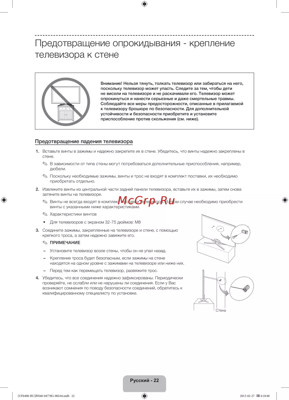 - Предотвращение опрокидывания крепление телевизора к стене p.22