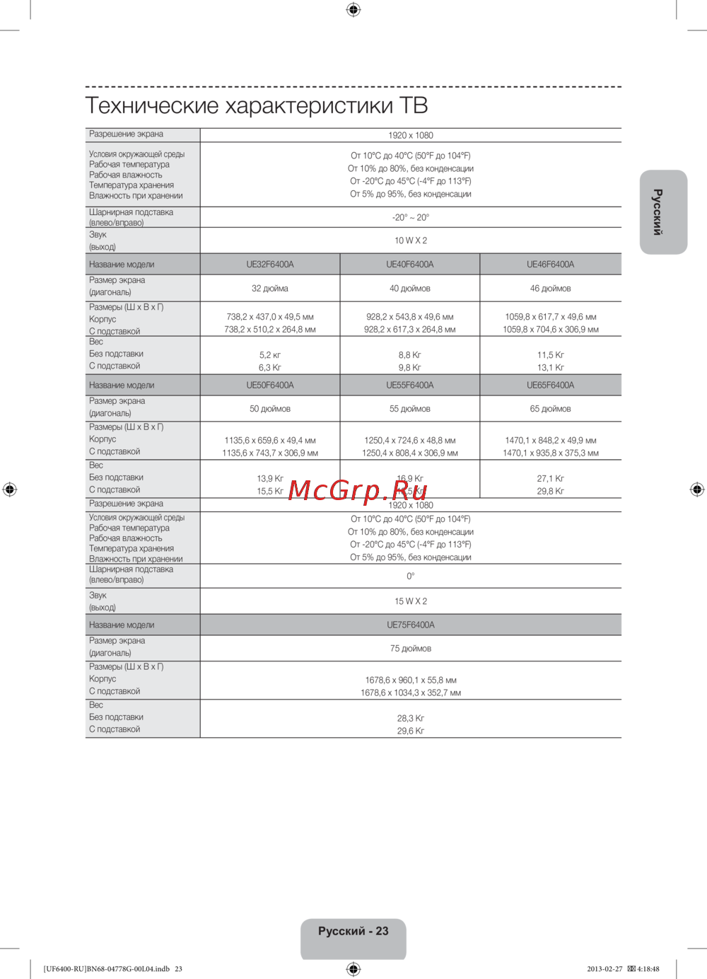 Samsung UE40F6400AK [23/25] Технические характеристики