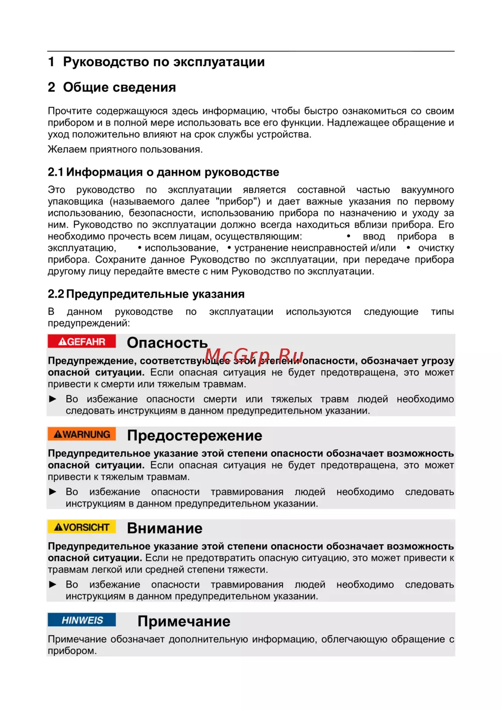 2.2 Предупредительные указания