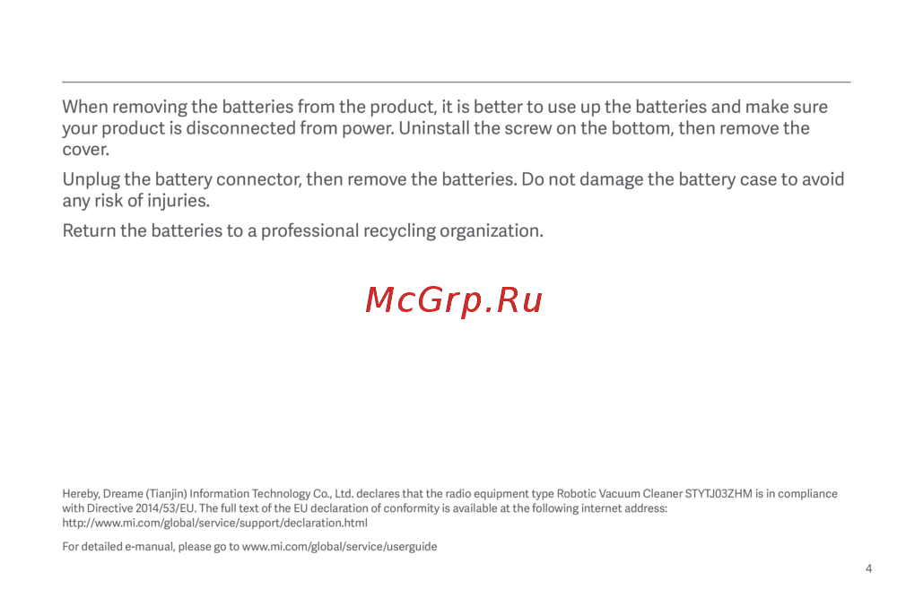 When removing the batteries from the product it is better to use up the batteries and make sure your product is disconnected from power Uninstall the screw on the bottom then remove the cover Unplug the battery connector then remove the batteries Do not damage the battery case to avoid any risk of injuries Return the batteries to a professional recycling organization Hereby Dreame Tianjin Information Technology Co Ltd declares that the radio equipment type Robotic Vacuum Cleaner STYTJ03ZHM is in compliance with Directive 2014 53 EU The full text of the Ell declaration of conformity is available at the following internet address http www mi com global service support declaration html Fordetailed e manual please go to www mi com global service userguide 4