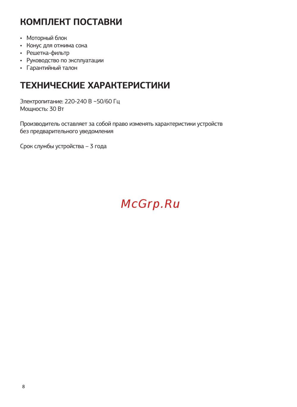 КОМПЛЕКТ ПОСТАВКИ Моторный блок Конус для отжима сока Решетка фильтр Руководство по эксплуатации Г арантийный талон ТЕХНИЧЕСКИЕ ХАРАКТЕРИСТИКИ Электропитание 220 240 В 50 60 Гц Мощность 30 Вт Производитель оставляет за собой право изменять характеристики устройств без предварительного уведомления Срок службы устройства 3 года 8