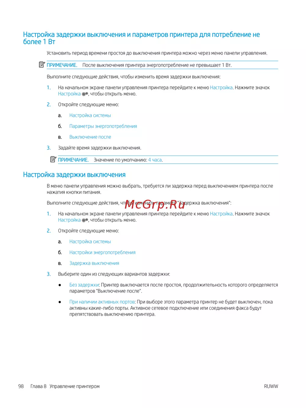 HP Color LaserJet Pro M182n (7KW54A) [110/184] Настройка задержки выключения и параметров принтера для потребление не более 1 вт