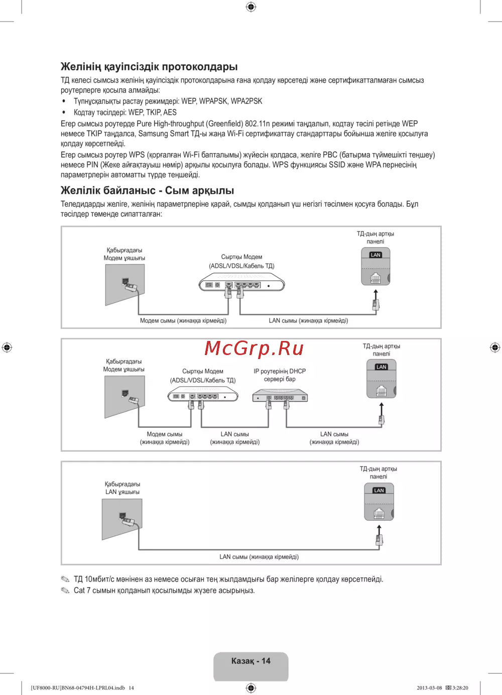 - Егер сымсыз роутерде pure high throughput greenfield 802 1n режимі таңдалып кодтау тәсілі ретінде wep немесе tkip таңдалса samsung smart тд ы жаңа wi fi сертификаттау стандарттары бойынша желіге қосылуға қолдау көрсетпейді егер сымсыз роутер wps қорғалған wi fi бапталымы жүйесін қолдаса желіге pbc батырма түймешікті теңшеу немесе pin жеке айғақтауыш нөмір арқылы қосылуға болады wps функциясы ssid және wpa пернесінің параметрлерін автоматты түрде теңшейді p.83