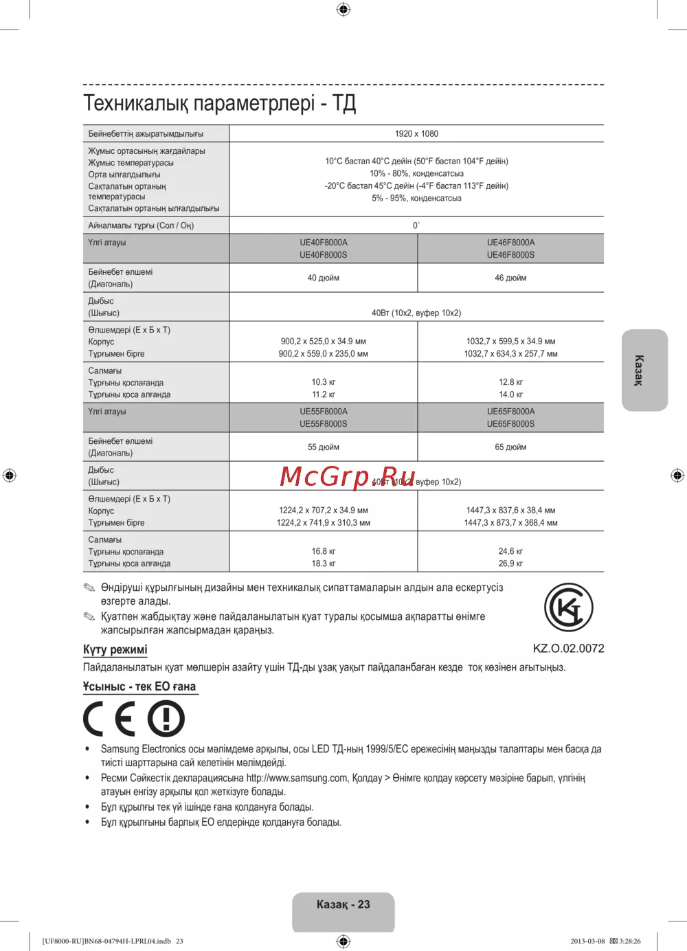 • Samsung Electronics осы мәлімдеме арқылы, осы LED ТД-ның 1999/5/EC ережесінің маңызды талаптары мен басқа да