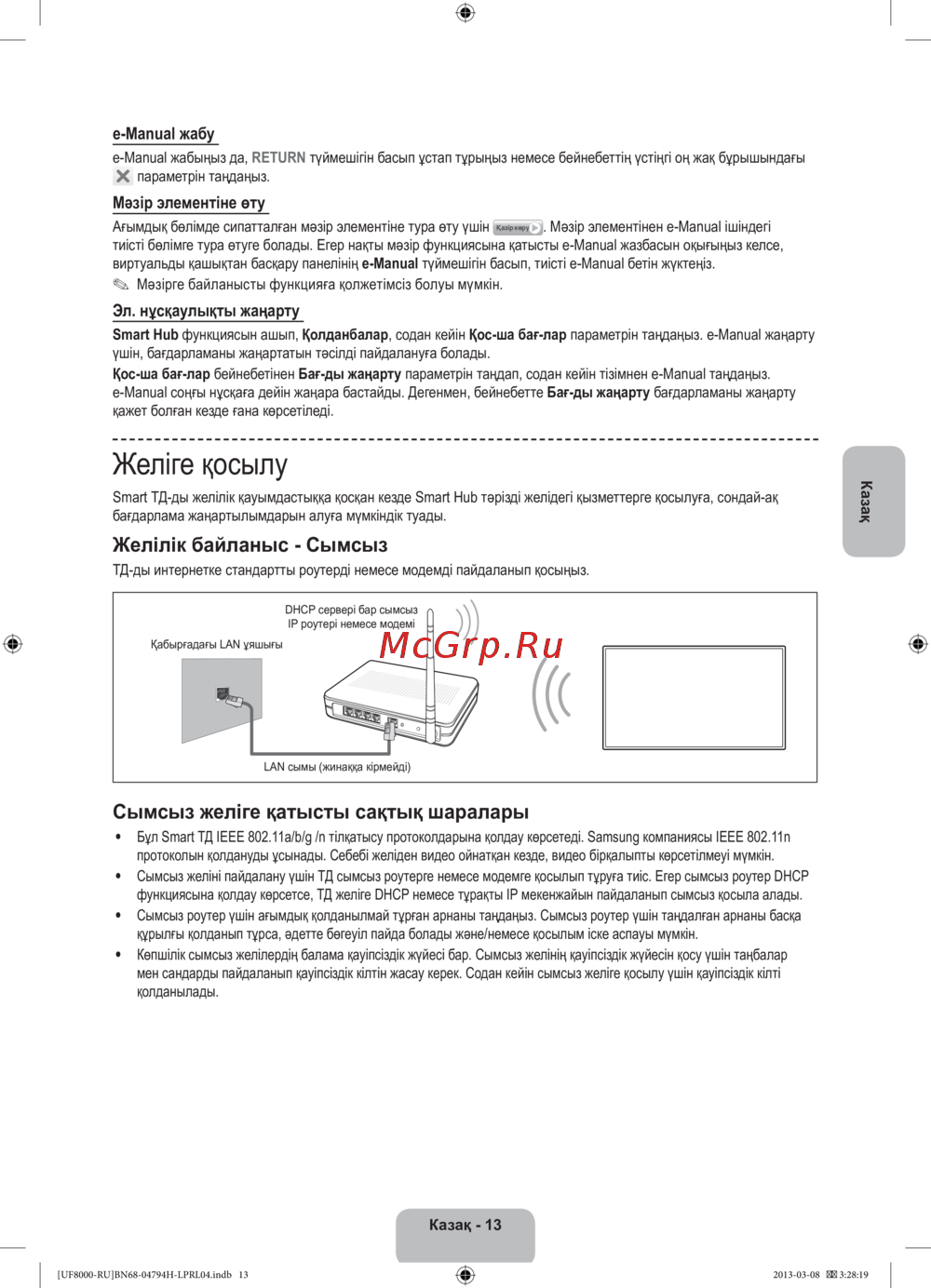 • Бұл Smart ТД IEEE 802.11a/b/g /n тілқатысу протоколдарына қолдау көрсетеді. Samsung компаниясы IEEE 802.11n