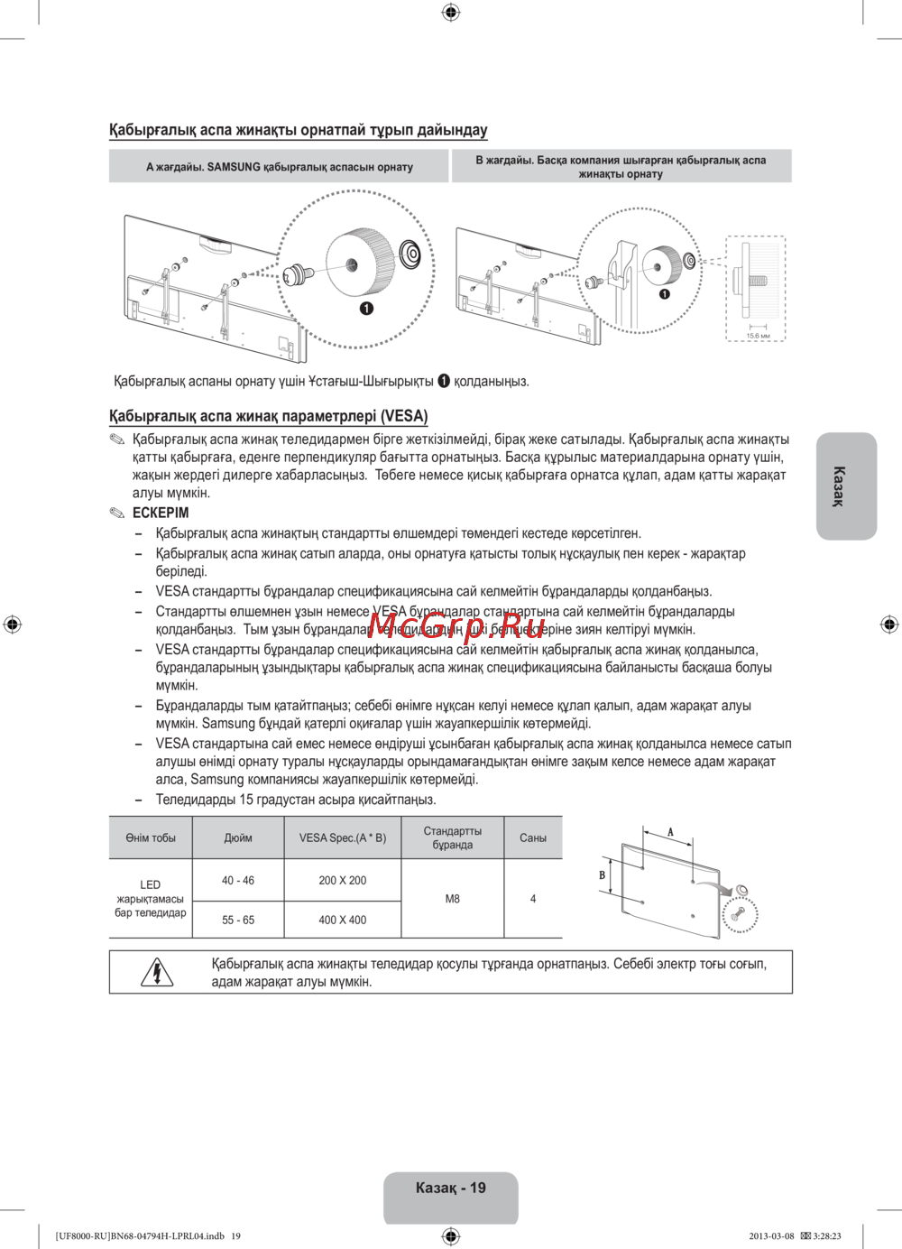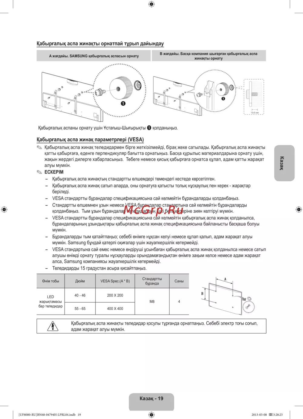 Samsung UE40F8000AT — қабырғалық аспа жинағын орнату: Нұсқаулық және қауіпсіздік шаралары [88/93]