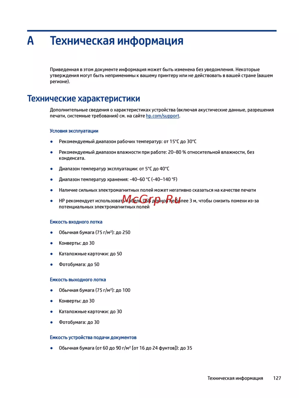 Узнайте о технических характеристиках и условиях эксплуатации печатающих устройств. Важные данные о температуре, влажности и емкости лотков для бумаги.