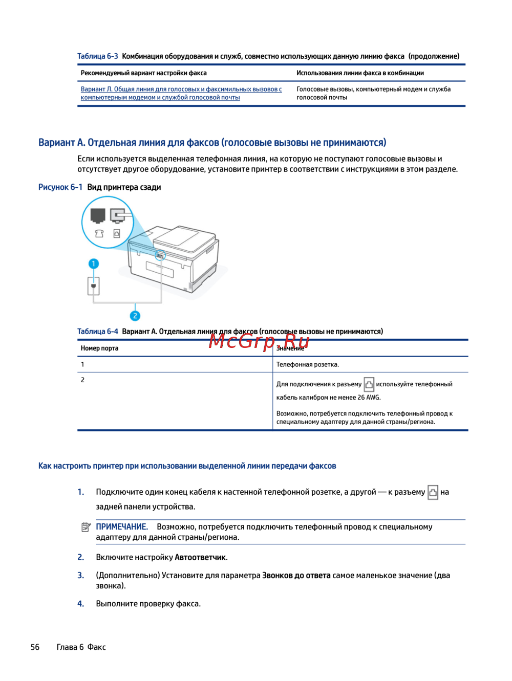 Таблица 6-4 Вариант А. Отдельная линия для факсов (голосовые вызовы не принимаются)