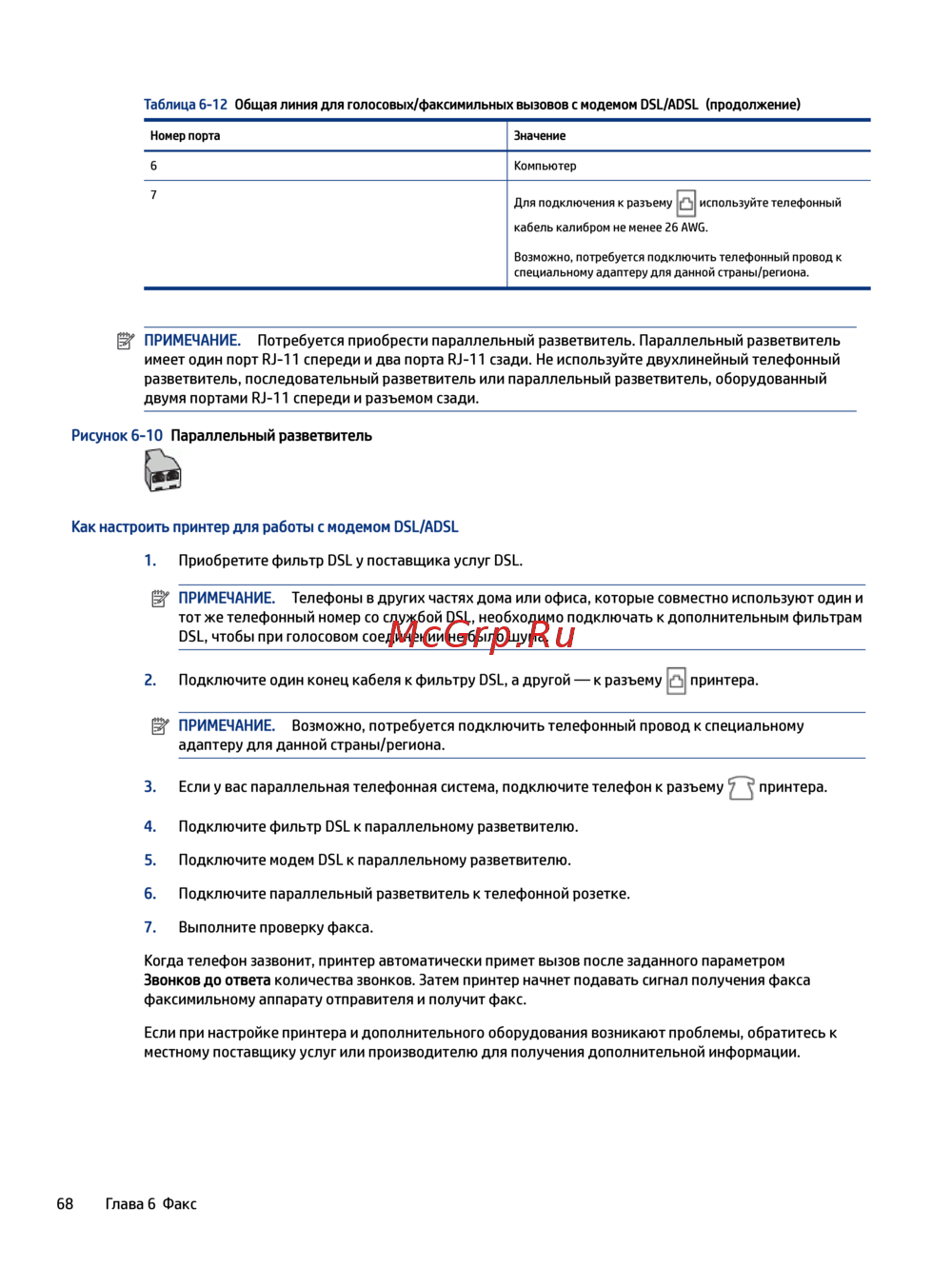 Таблица 6-12 Общая линия для голосовых/факсимильных вызовов с модемом DSL/ADSL (продолжение)