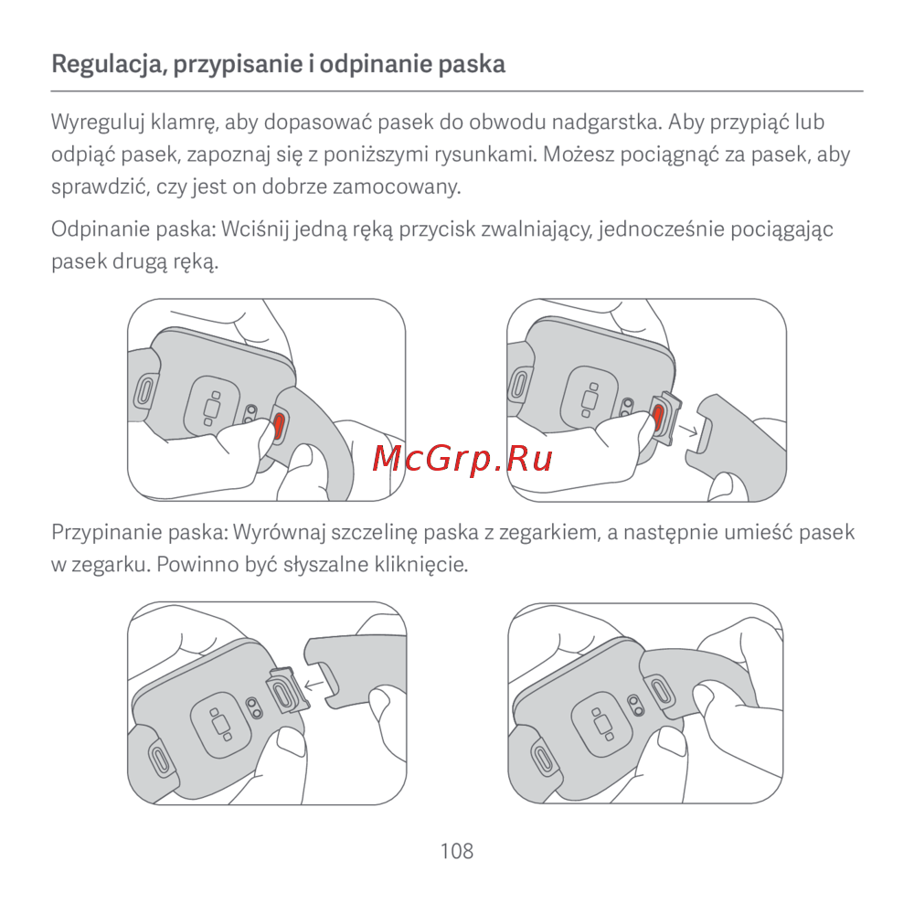 Przypinanie paska: Wyrównaj szczelinę paska z zegarkiem, a następnie umieść pasek