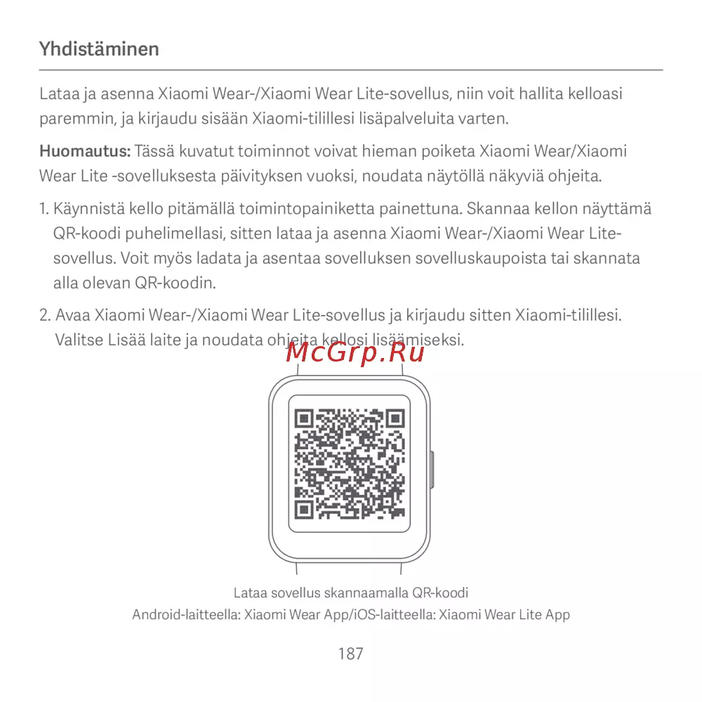 QR-koodi puhelimellasi, sitten lataa ja asenna Xiaomi Wear-/Xiaomi Wear Lite-