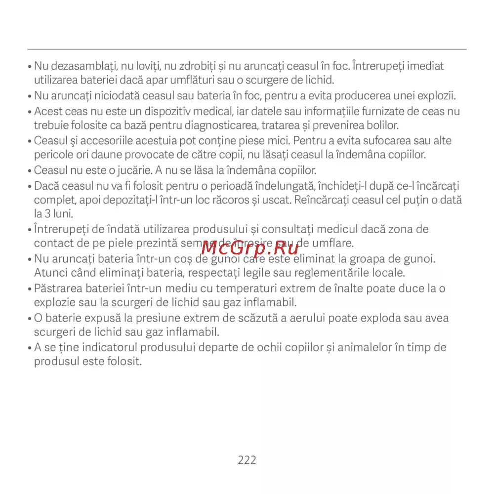 • Nu aruncați niciodată ceasul sau bateria în foc, pentru a evita producerea unei explozii.