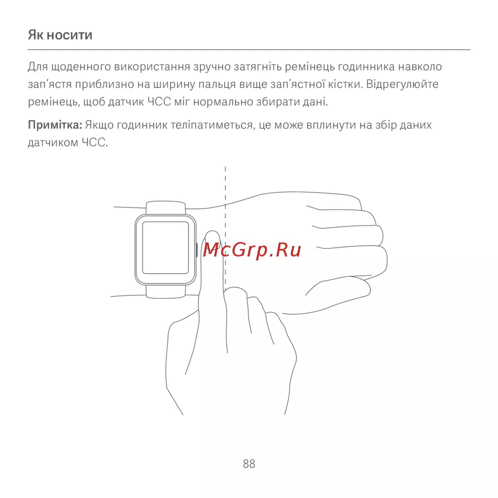 зап’ястя приблизно на ширину пальця вище зап’ястної кістки. Відрегулюйте