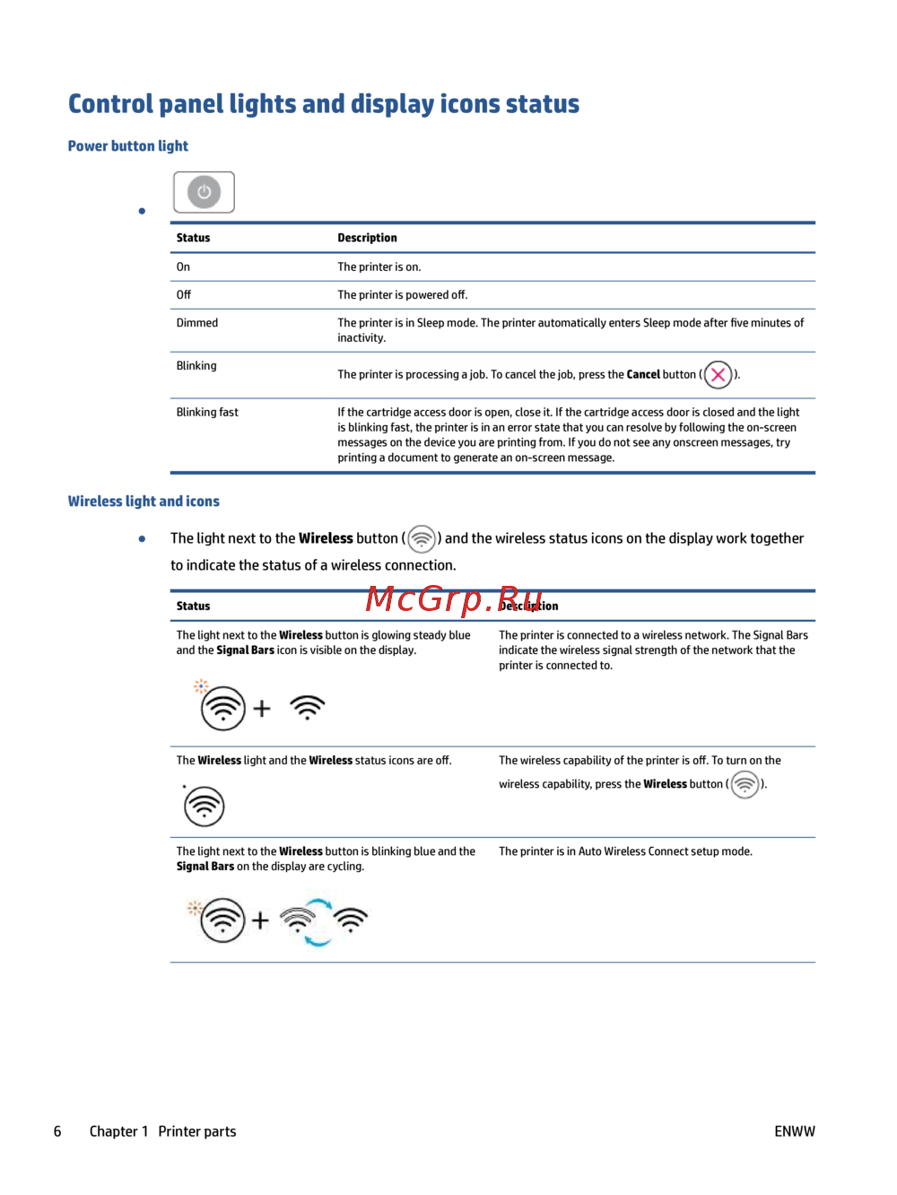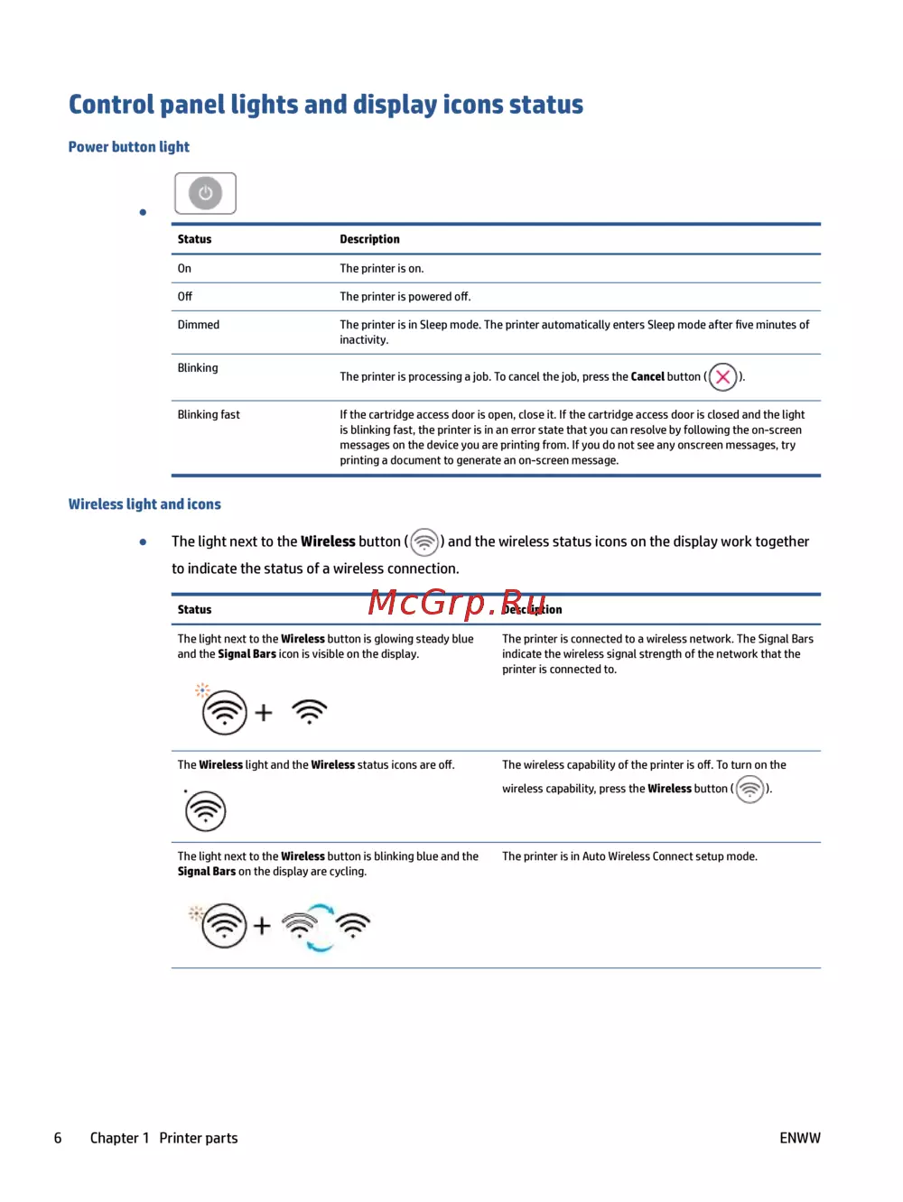 The Wireless light and the Wireless status icons are o. The wireless capability of the printer is o. To turn on the