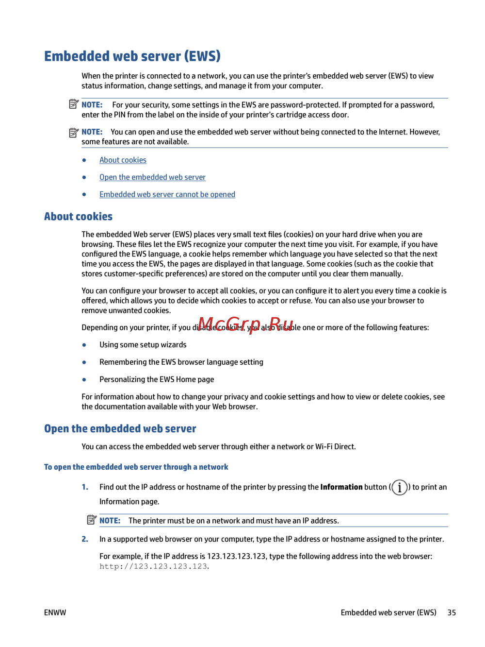 The embedded Web server (EWS) places very small text les (cookies) on your hard drive when you are