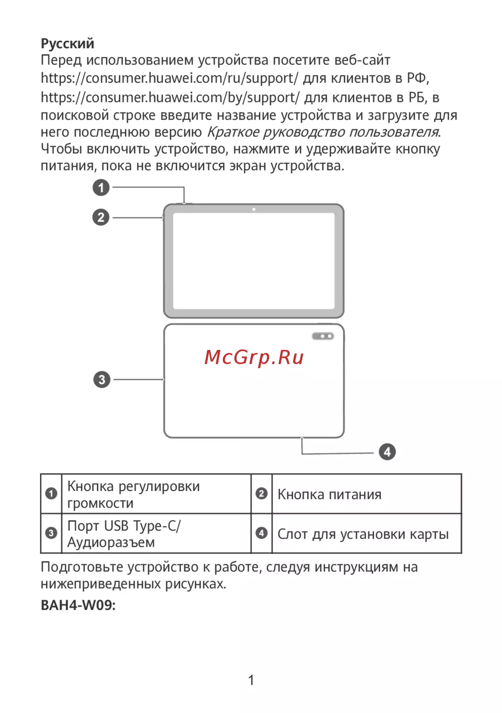 - Русскийперед использованием устройства посетите веб сайт https consumer huawei com ru support для клиентов в рф https consumer huawei com by support для клиентов в рб в поисковой строке введите название устройства и загрузите для него последнюю версию краткое руководство пользователя чтобы включить устройство нажмите и удерживайте кнопку питания пока не включится экран устройства кнопка регулировки громкостикнопка питанияпорт usb type c аудиоразъемслот для установки картыподготовьте устройство к работе следуя инструкциям на нижеприведенных рисунках bah4 w09 bah4 l09 инструкции по технике безопасностиперед использованием устройства внимательно прочтите правила техники безопасности более подробную информацию можно найти на веб сайте https consumer huawei com ru support безопасная эксплуатация во избежание повреждения органов слуха не слушайте музыку на высокой громкости в течение длительного времени оптимальная температура от 0 c до 35 c для эксплуатации от 20 c до 45 c для хранения опти p.2