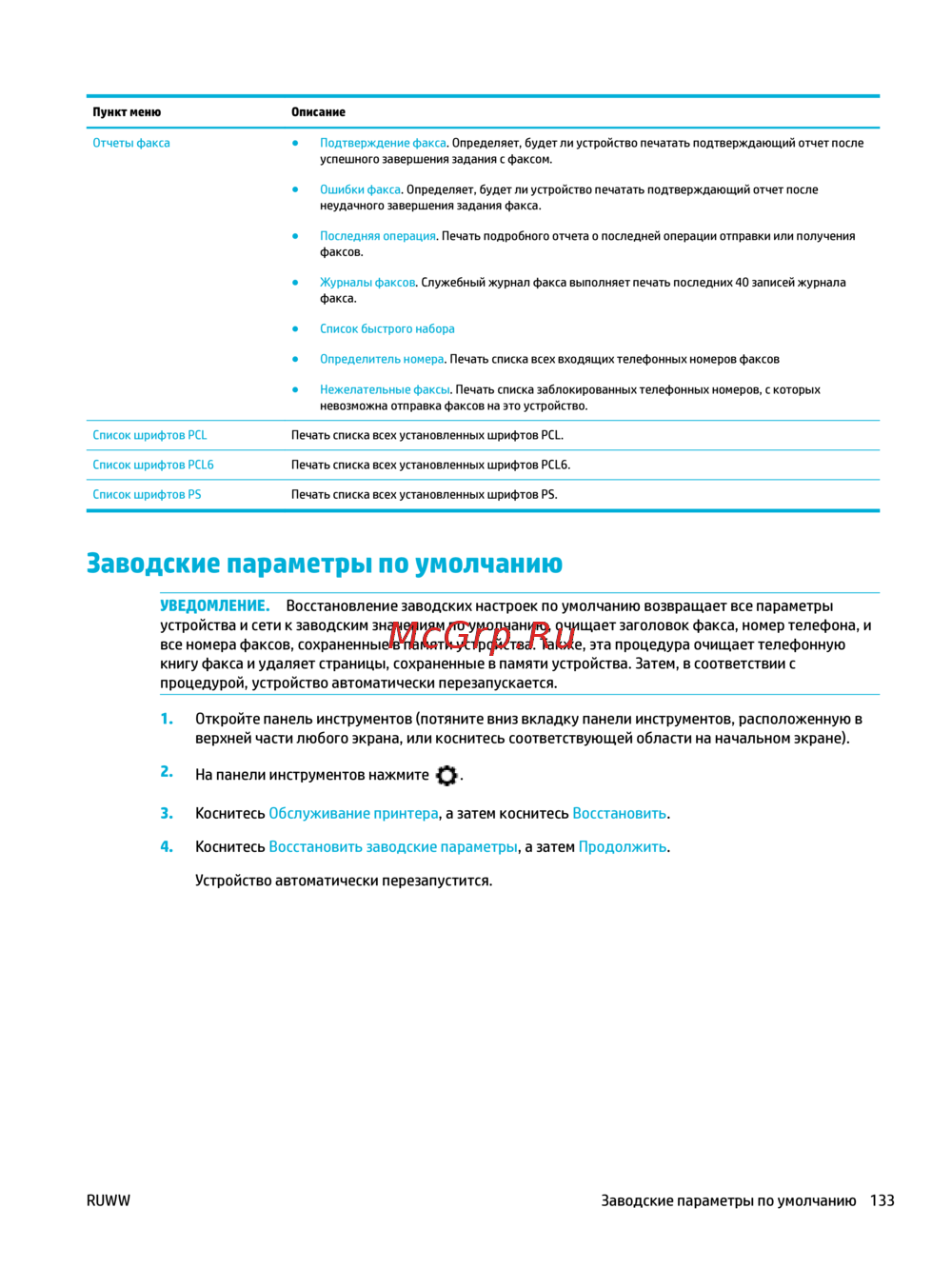устройства и сети к заводским значениям по умолчанию, очищает заголовок факса, номер телефона, и