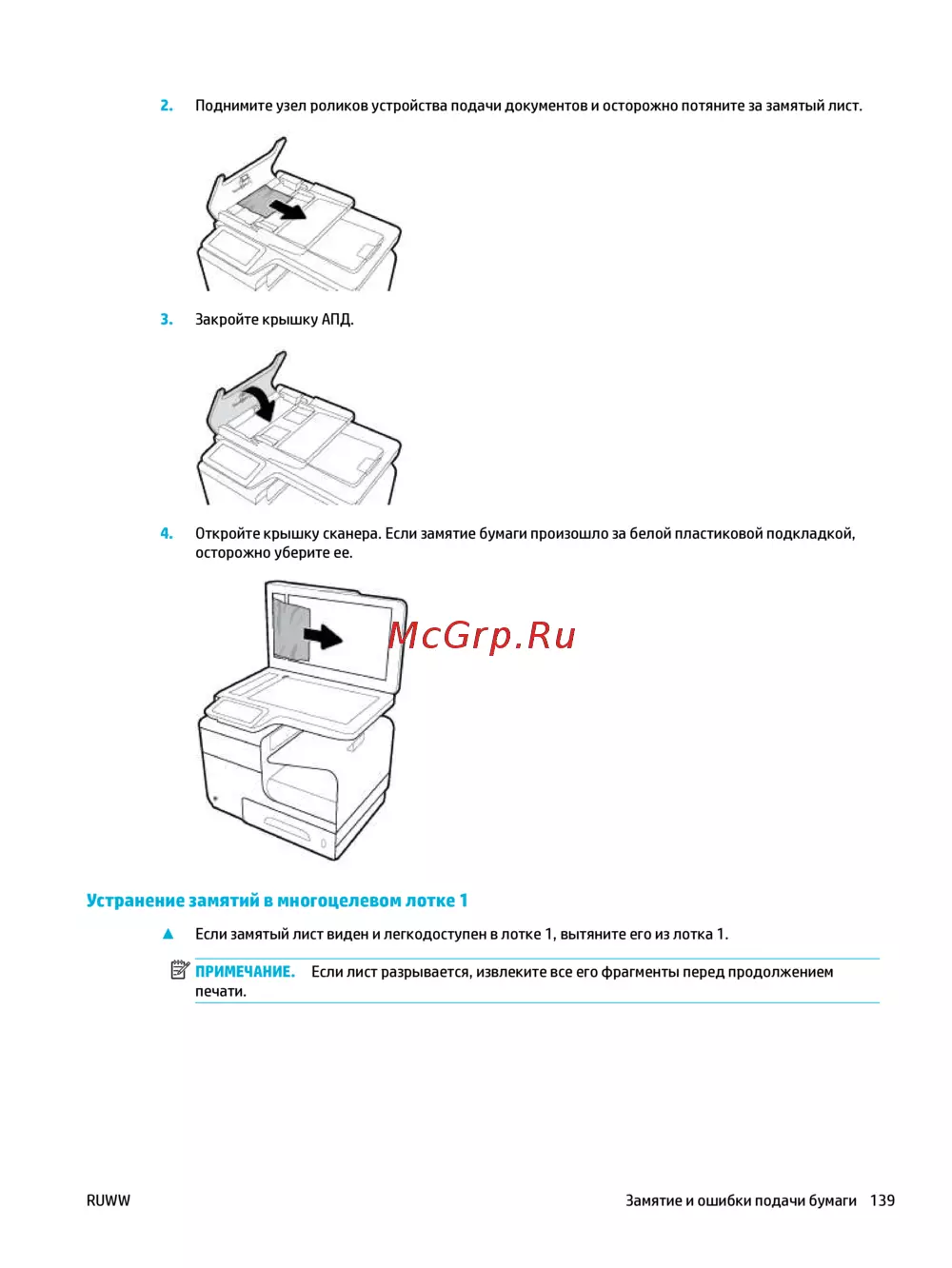 RUWW Замятие и ошибки подачи бумаги 139