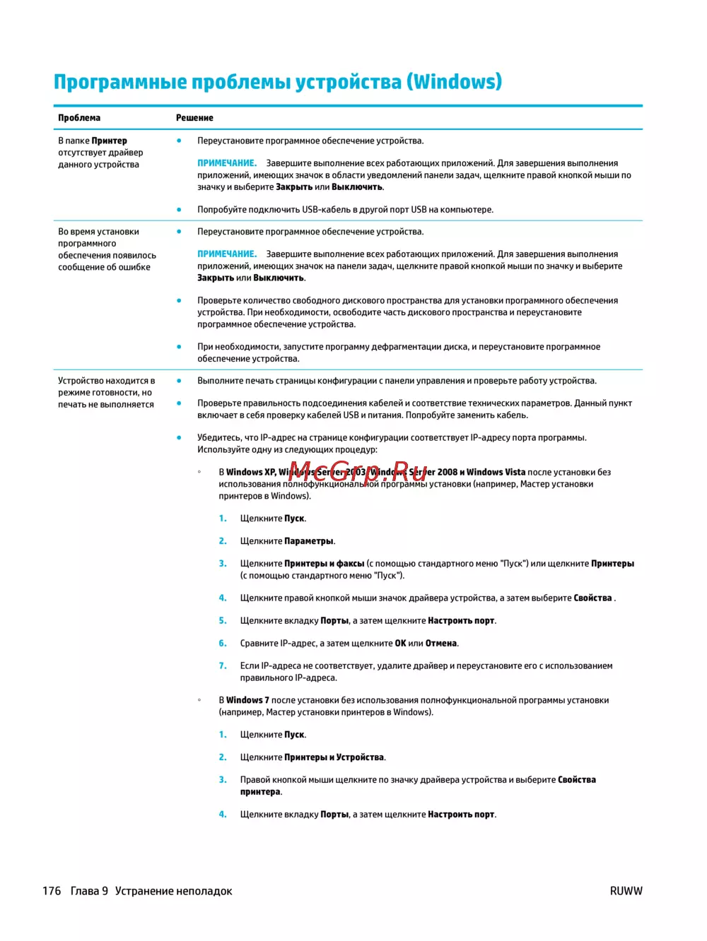 176 Глава 9 Устранение неполадок RUWW