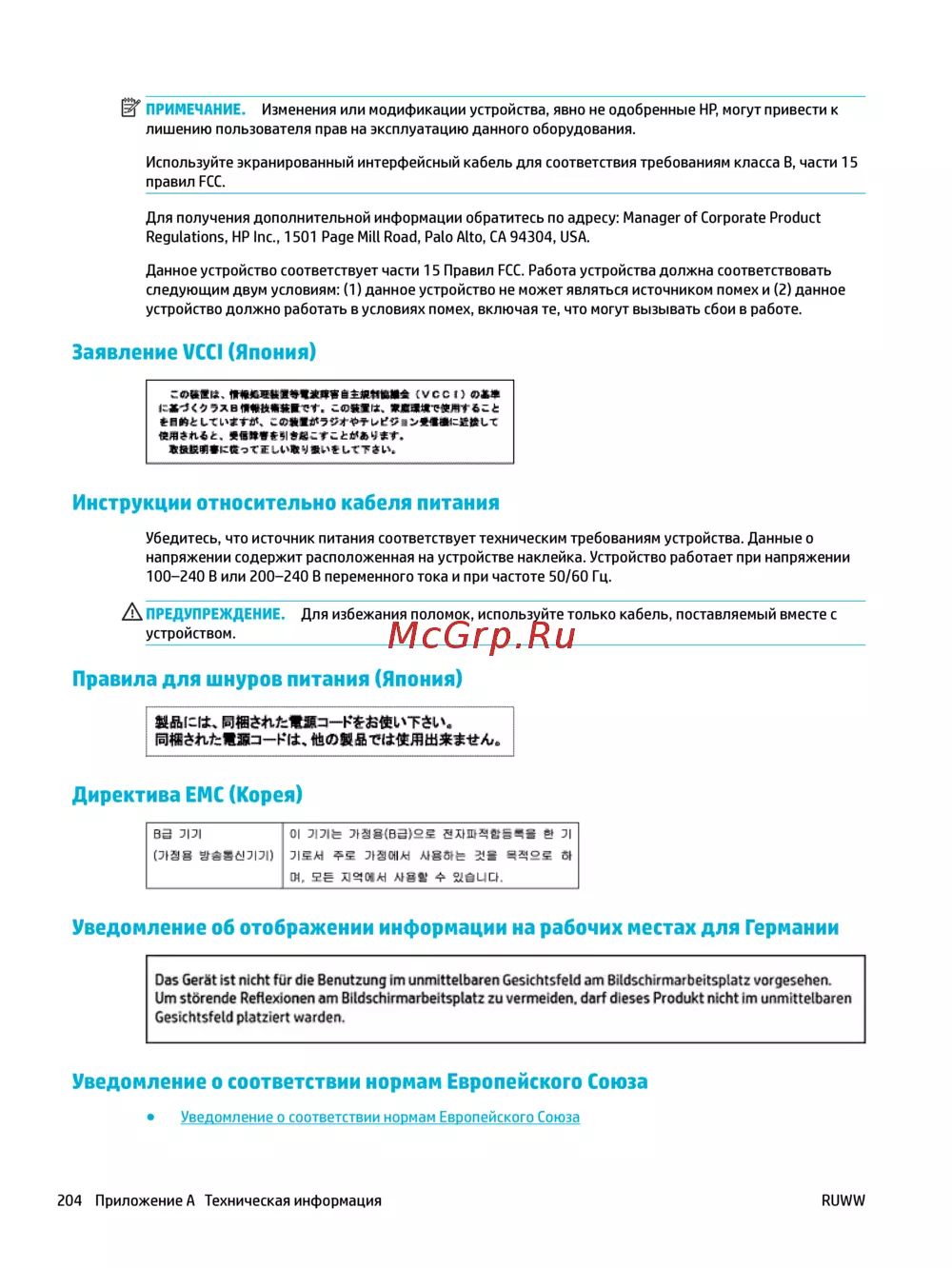 - Примечание компания hp не рекомендует использовать устройство в помещениях где расположены постоянные рабочие места сотрудников p.212