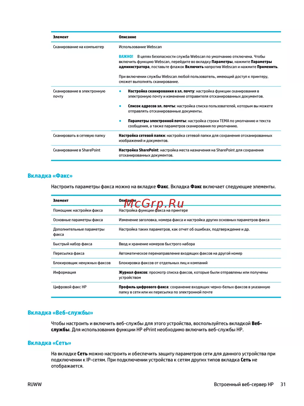RUWW Встроенный веб-сервер HP 31