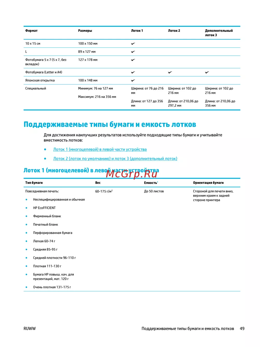 RUWW Поддерживаемые типы бумаги и емкость лотков 49