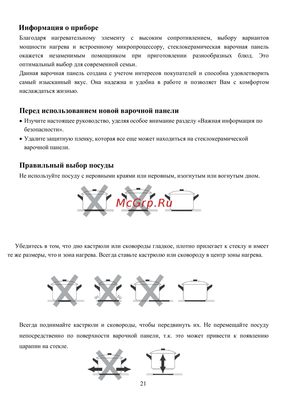 Не используйте посуду с неровными краями или неровным, изогнутым или вогнутым дном.