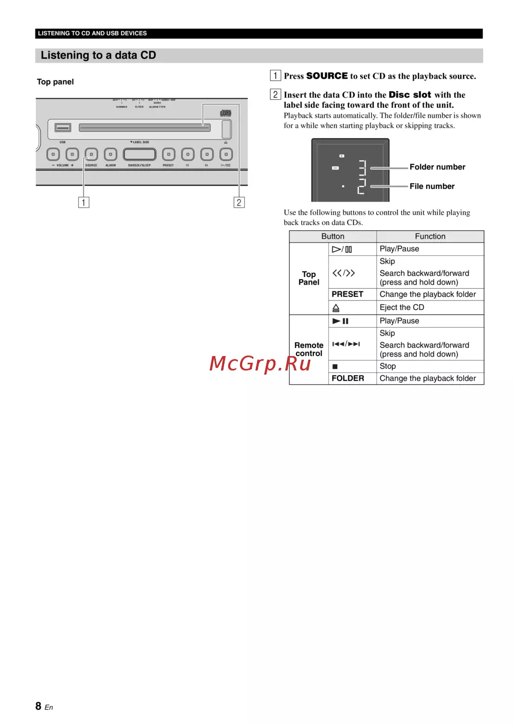 - Insert the data cd into the disc slot with the label side facing toward the front of the unit p.10