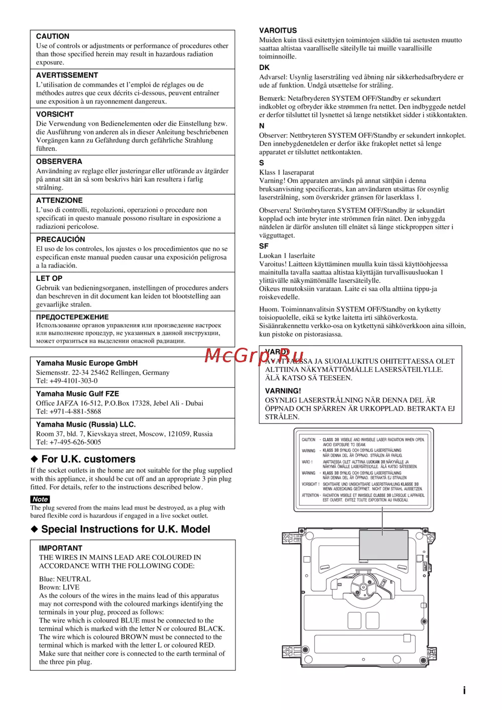 - Лазерный компонент данного изделия может излучать радиацию превышающую предел радиации для класса 1 p.193