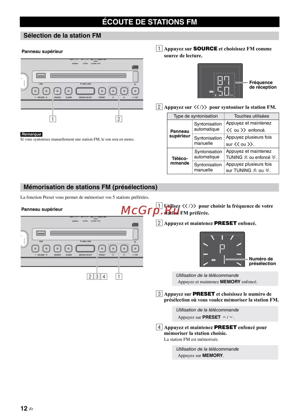 Si vous syntonisez manuellement une station FM, le son sera en mono.