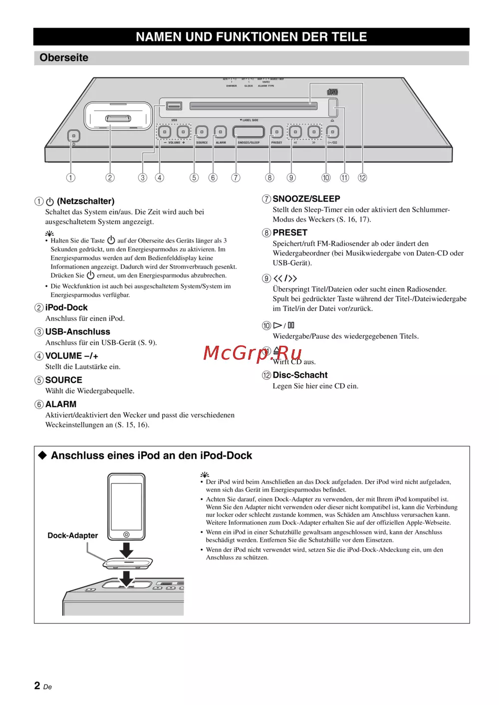 • Wenn der iPod nicht verwendet wird, setzen Sie die iPod-Dock-Abdeckung ein, um den