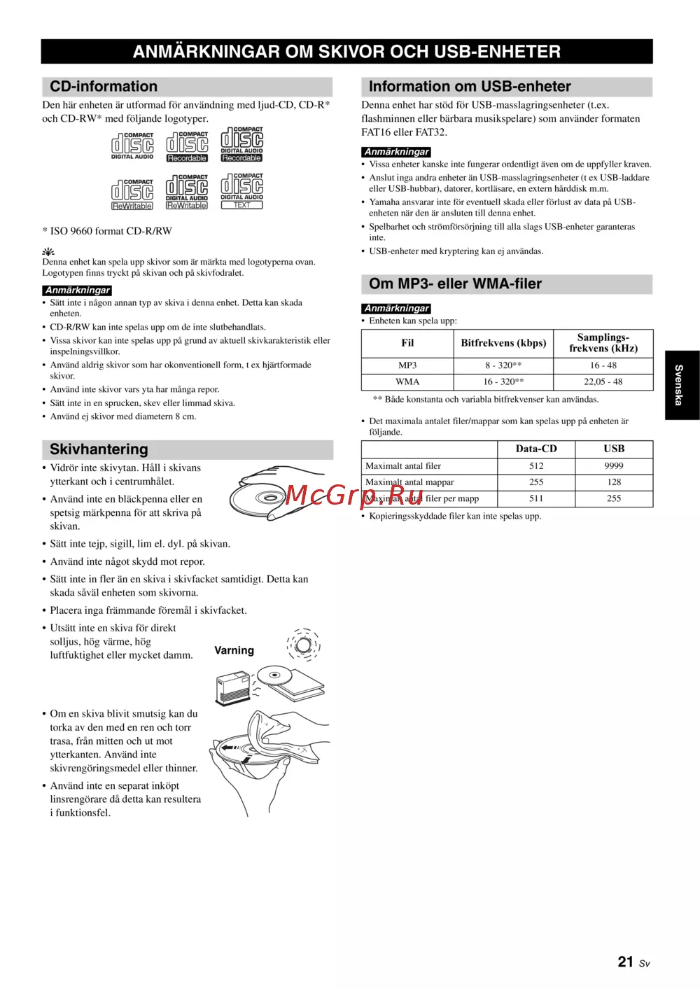 ANMÄRKNINGAR OM SKIVOR OCH USB-ENHETER