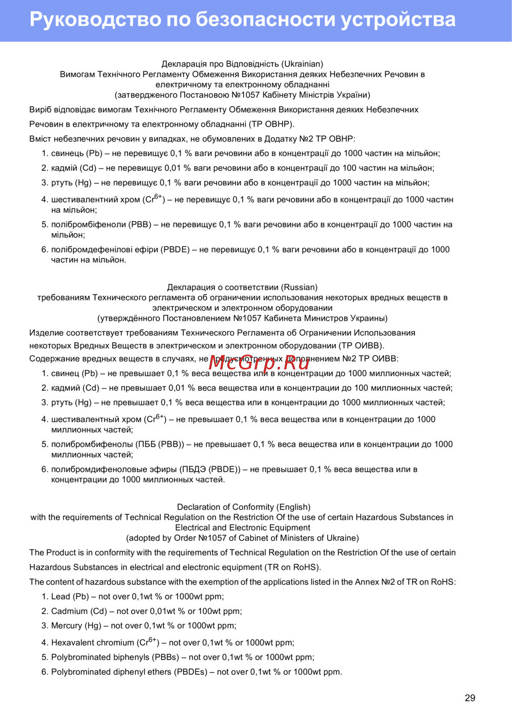 Виріб відповідає вимогам Технічного Регламенту Обмеження Використання деяких Небезпечних