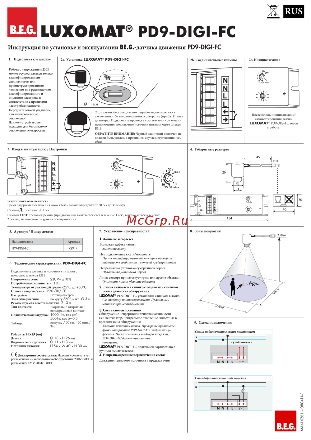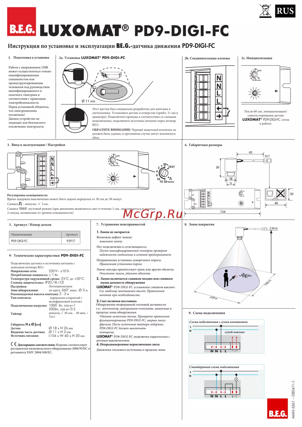 B.E.G. 92917 — инструкция по установке и эксплуатации датчика движения [1/1]