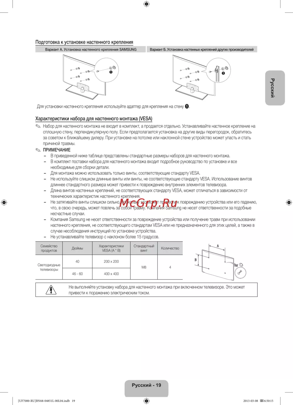 Вариант А. Установка настенного крепления SAMSUNG Вариант Б. Установка настенных креплений других производителей