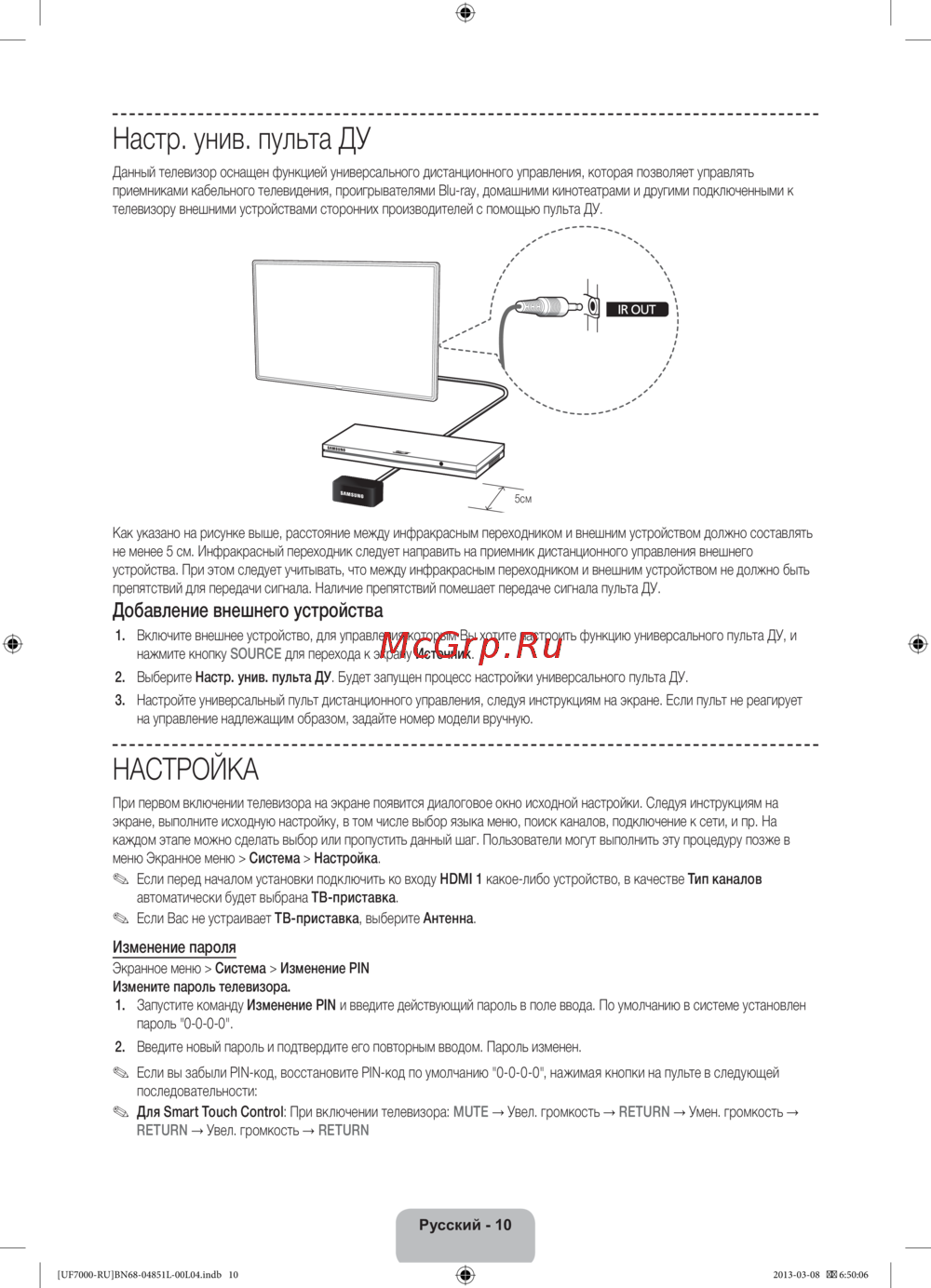 Для Smart Touch Control: При включении телевизора: MUTE → Увел. громкость → RETURN → Умен. громкость →
