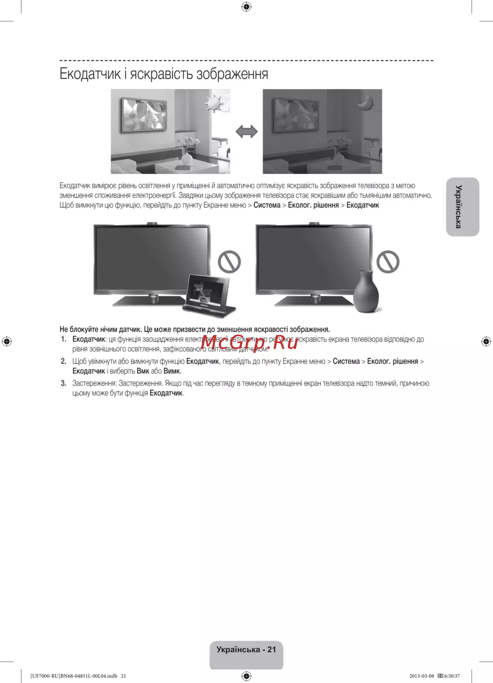 1. Екодатчик: ця функція заощадження електроенергії автоматично регулює яскравість екрана телевізора відповідно до