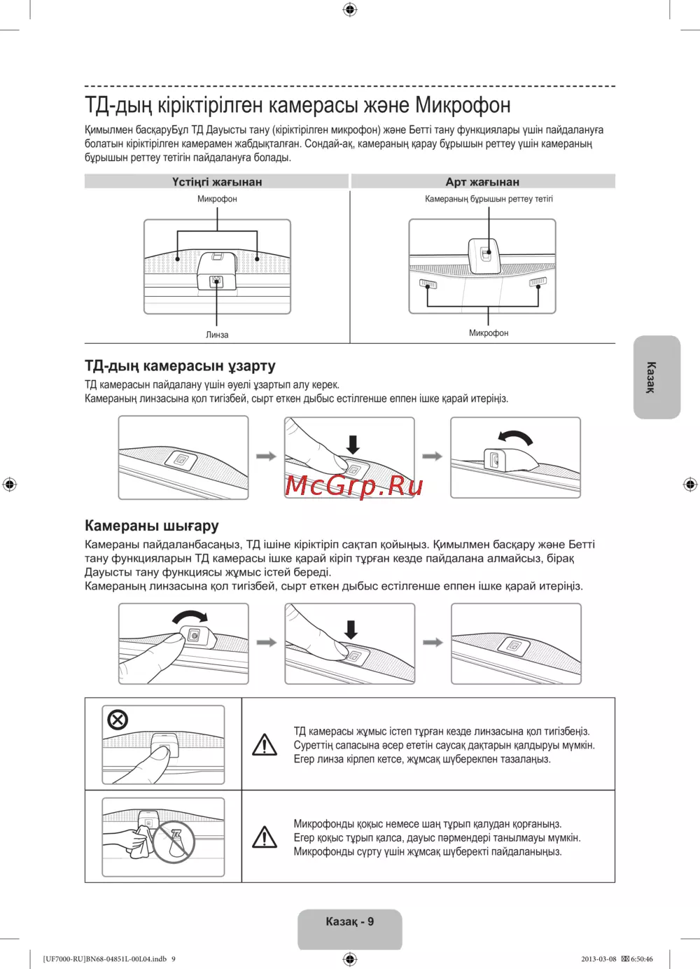 - Камераны пайдаланбасаңыз тд ішіне кіріктіріп сақтап қойыңыз қимылмен басқару және бетті тану функцияларын тд камерасы ішке қарай кіріп тұрған кезде пайдалана алмайсыз бірақ дауысты тану функциясы жұмыс істей береді камераның линзасына қол тигізбей сырт еткен дыбыс естілгенше еппен ішке қарай итеріңіз p.78